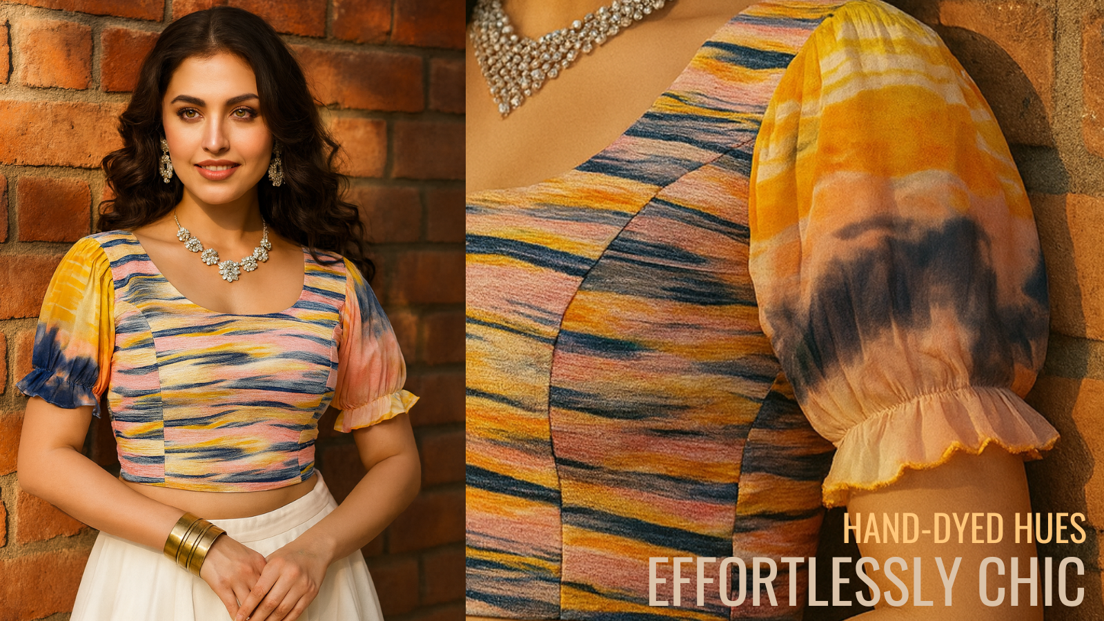 Finestfit Latest Fashion Readymade Blouses for Women - Round Neckline, Georgette Band Sleeves with Hand Dyed Crochet Lace Adornments.41010