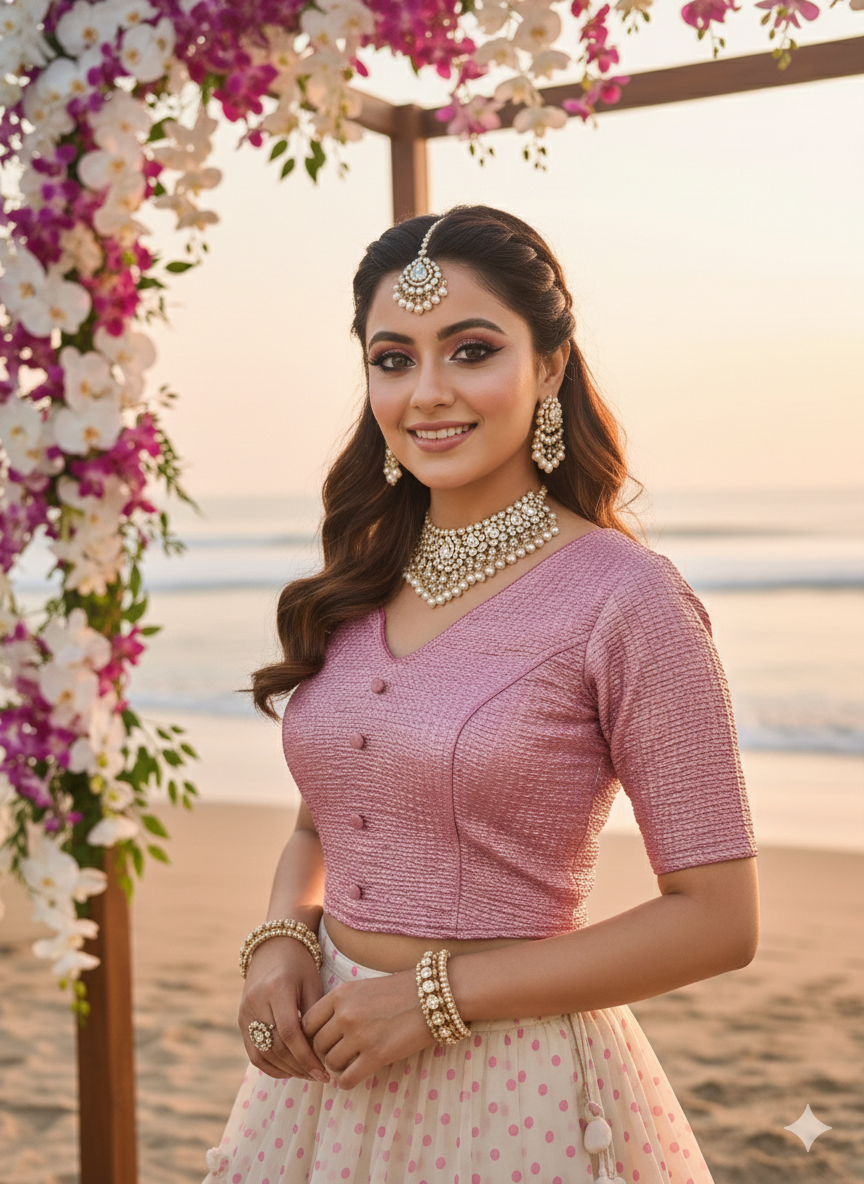 Upgrade your ethnic wardrobe with this Premium Stretchable, V neckline with fabric buttons on top of it ,Made using high-quality stretch shimmer embossed fabric crafted for women who value comfort, style, and durability.This blouse offers a snug yet flexible fit that adapts beautifully to different body shapes. The elbow sleeve , provide a graceful silhouette, making it suitable for daily wear, office wear, festive occasions, and casual outings.