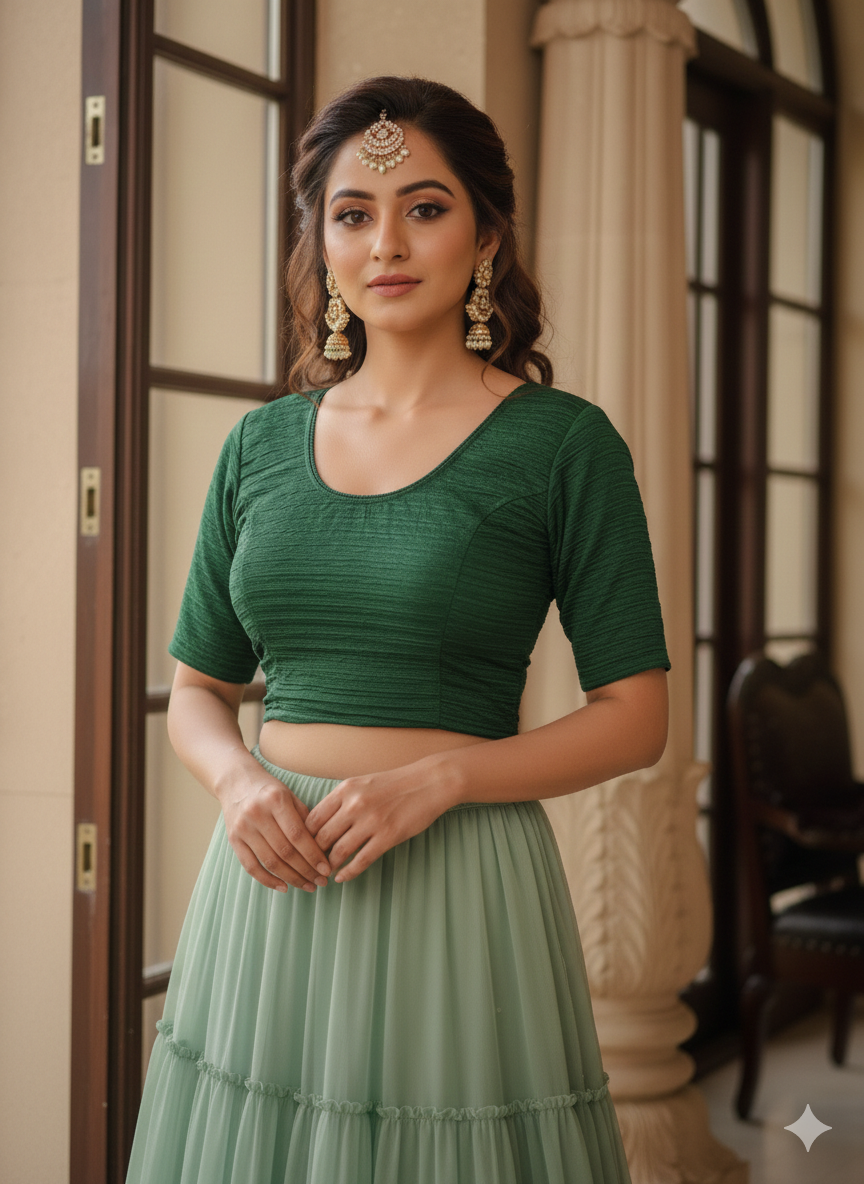 Upgrade your ethnic wardrobe with this Premium Stretchable, round neckline luxe self textured fabric crafted for women who value comfort, style, and durability.This blouse offers a snug yet flexible fit that adapts beautifully to different body shapes. The V overlap back neckline detail and elbow sleeves ย , provide a graceful silhouette, making it suitable for daily wear, office wear, festive occasions, and casual outings.