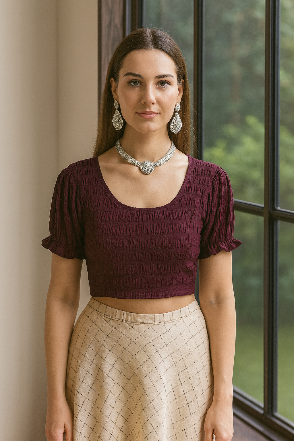 The construction of the blouse takes into consideration both aesthetics and functionality. The round neckline flatters all body types, ensuring that it suits a wide range of women. Whether you prefer a relaxed fit or something a little snugger, the FINESTFIT READYMADE BALLOON SLEEVES BLOUSE accommodates various body shapes, providing a sophisticated silhouette. The balloon sleeves not only make a bold style statement but are also designed to move gracefully with you, adding dynamism to your presence.