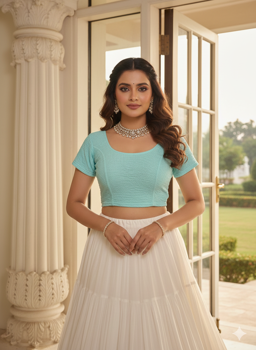 Stay On Trend: Latest Fashion Readymade Blouses for Women,round neckline ,balloon sleeves, adorned with crochet style lace..41015