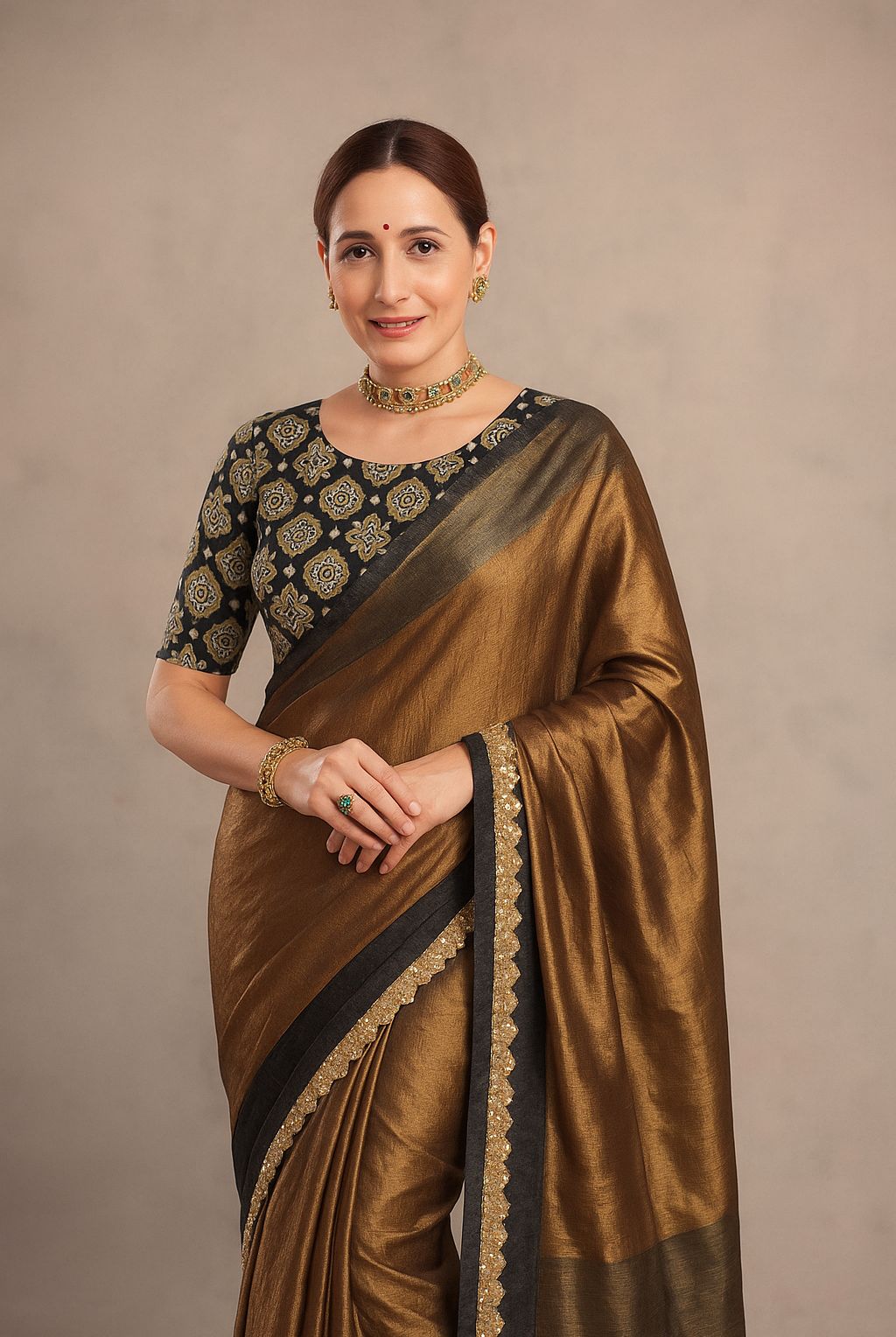 Stay On Trend with Latest Fashion Readymade Blouses for Women - Round Neckline, Elbow Sleeves & Hand-Stitched Golden Flowers.29007