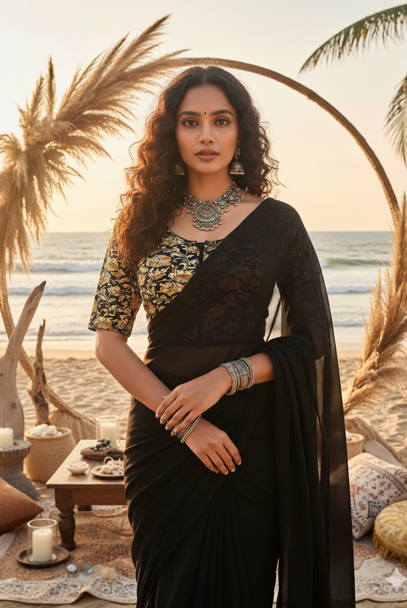 Stay On Trend: Latest Fashion Readymade Blouses for Women,round neckline,organza band sleeves adorned with black swarovski.41030